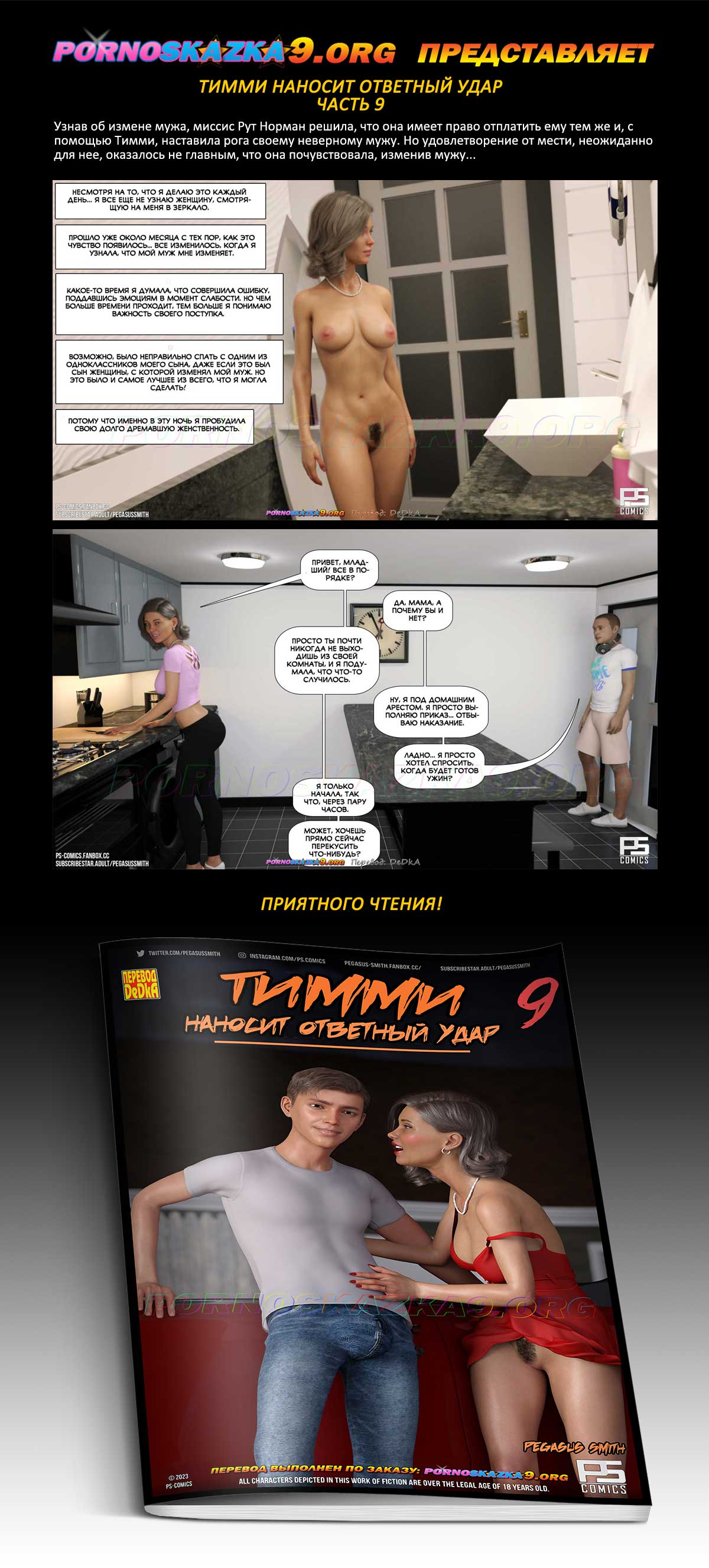 Порно комикс Тимми наносит ответный удар. Часть 9. Узнав об измене мужа, миссис Рут Норман решила, что она имеет право отплатить ему тем же и, с помощью Тимми, наставила рога своему неверному мужу. Но удовлетворение от мести, неожиданно для нее, оказалось не главным, что она почувствовала, изменив мужу…